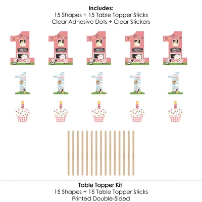 Girl Farm Animals Centerpiece Sticks INCLUDES 15 Pink Barnyard table toppers in three different shapes, 15 sticks, and stickers for easy assembly. Pink Barnyard party table decorations are perfect for a 1st Birthday Party. Girl Farm Animals Party Centerpiece Sticks SIZE 5 – Pink Number “1” Shape 1 Table Toppers (7.75” x 10.75”), 5 – Smaller Number “1” with farm animal design Shape 2 Table Toppers (4.75” x 7”), and 5 – Pink Cupcake Shape 3 Table Toppers (5” x 7”). The unique design and variety of pieces makes this table decoration kit an impressive addition to any Pink Barnyard theme party. EASY PARTY DECOR: Girl Farm Animals table decorations can be used as centerpieces when attached to the included sticks and inserted into vases or floral arrangements. They easily accent your First Birthday Party candy buffet when you add them to apothecary jars. Table toppers are also a great addition to any photo booth. The large, shaped cut outs will make your party pics instantly shareable. Pink Barnyard party centerpiece sticks are sure to make a statement however you choose to use them! PREMIUM PARTY SUPPLIES: Girl Farm Animals party table toppers are professionally printed on heavy-duty cardstock paper with a photo-like shine. They are individually inspected and carefully packaged by hand with sticks and stickers for easy assembly. Get creative with your DIY party ideas! MADE IN THE USA: Girl Farm Animals Party Centerpiece Sticks are designed and manufactured at our Wisconsin facility using materials that are Made in America.