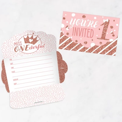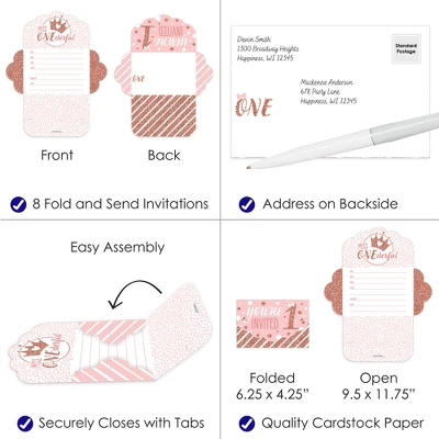 1st Birthday Little Miss Onederful Fold and Send Invitations includes a set of 8 Girl First Birthday Party invitations. This all-in-one set of invites can be folded into an envelope and comes with clear stickers for secure delivery. Splendid Surprise: Excite your partygoers with these unique and charming invites that turn into envelopes. Rose Gold invitations include fill-in-the-blank space to add your party details. Once assembled, you can directly hand the invites to your recipients or write out the address information on the backside and send your invite via snail mail. Easy Assembly: To transform your invite into an envelope, begin by folding the sides inward. Next, fold and attach the bottom flap by inserting the tabs into the slots of the side flaps. Finally, fold the top flap over and insert its tabs into the slots. Seal your envelope shut using a clear sticker. Practice assembling using the instruction card included. Premium Party Supply: 1st Birthday Little Miss Onederful party invitations are professionally printed double-sided on quality cardstock paper with a photo-like shine. When folded, invite cards measure 6.25 inches wide x 4.25 inches tall, and when open, cards measure 9.5 inches wide x 11.75 inches tall. Made In The USA: Rose Gold Fold and Send Invitations are designed and manufactured at our Wisconsin facility using materials that are Made in the USA. 1st Birthday Little Miss Onederful Fold and Send Invitations uses a No-Mess Glitter Print: Our invitations are designed with a printed image of glitter, eliminating glitter flake while maximizing bling effect!