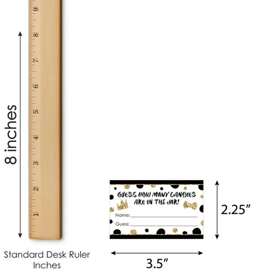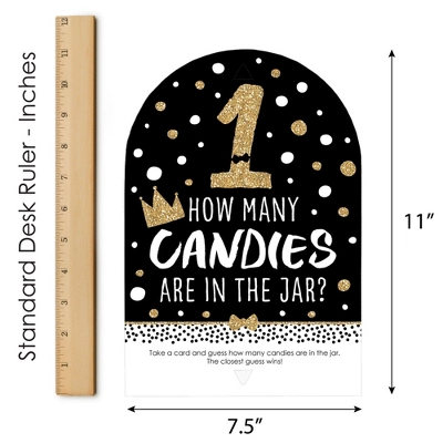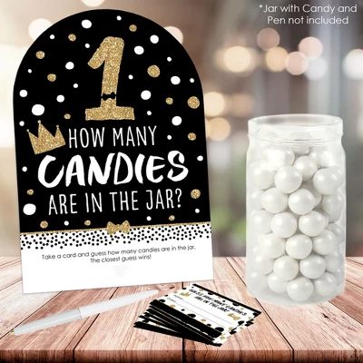 1st Birthday Little Mr. Onederful Candy Guessing Game INCLUDES 1 sign with a built-in stand and 40 guessing cards that will look great at your First Birthday Party. Sign measures 7.5” wide by 11” tall and cards measure 3.5” by 2.25” tall. Candy and jar are not included. HOW TO PLAY: Draw attention to your candy jar with the 1st Birthday Little Mr. Onederful Candy Guessing Game! Place the sign and cards next to your candy jar. Guests can then take a card and guess how many candies are in the jar. The closest guess wins! EASY ASSEMBLY: To use, fold the sides of the stand towards the center. Then, fold down the support piece of the stand until it rests in the notches. Finally, display your Black and Gold sign next to your container of candy. HIGH-QUALITY SUPPLY: 1st Birthday Little Mr. Onederful Candy Guessing Game is professionally printed double-sided on sturdy cardstock paper with a photo-like shine. They are individually inspected and then carefully packaged by hand. Sign arrives flat with some easy assembly required. MADE IN THE USA: 1st Birthday Little Mr. Onederful Candy Guessing Game is designed and manufactured at our Wisconsin facility using materials that are Made in the USA. 1st Birthday Little Mr. Onederful Candy Guessing Games uses a No-Mess Glitter Print: Our signs and cards are designed with a printed image of glitter, eliminating glitter flake while maximizing bling effect!