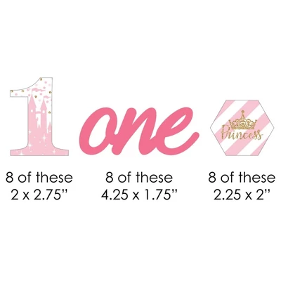 1st Birthday Little Princess Crown Straw Decor INCLUDES 24 paper cut outs, 24 coordinating paper straws & 40 clear stickers for easy assembly. 1st Birthday Little Princess Crown DIY party supplies are perfect for a first birthday party. Princess First Birthday Straw Decor party kit SIZE 8 # one 2″ wide x 2.75″ tall; 8 one (words) 4.25″ wide x 1.75″ tall; 8 hexagon 2.25″ wide x 2″ tall; and 24 chevron striped paper straws 7.75″ tall. EASY PARTY DECORATIONS: 1st Birthday Little Princess Crown straw decor will add a touch of charm to your birthday party tables. Princess 1st bday straw decor will also look great at your beverage bar. Use these adorable princess birthday party accessories as straws or swizzle sticks. The paper straws can also be cut in half and used as cupcake picks once the shaped cut out is attached. PREMIUM PARTY SUPPLIES: 1st Birthday Little Princess Crown paper cut out straw decorations are professionally printed on heavy-duty card stock paper with a photo-like shine. They are individually inspected and carefully packaged by hand, along with coordinating paper straws. 1st Birthday Little Princess Crown Straw Decor will require some easy assembly. Simply adhere the shaped cut outs to the straws using the included clear stickers. Please Note: Mason Jars shown for display purposes and are not included. Little Princess Crown – Striped Decorative Straws use a No-Mess Glitter Print: Our wrappers are designed with a printed image of glitter, eliminating glitter flake while maximizing bling effect!