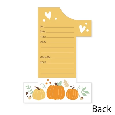 Little Pumpkin Fill-In the Blank Invitation Set INCLUDES 12 Orange & Teal Pumpkin party invitations and 12 premium white envelopes. Little Pumpkin fill-in invitation is perfect for any event. The Pumpkin theme is great for a Fall 1st Birthday. Autumn Pumpkin party invitations SIZE 5 inches by 7 inches. The included envelopes measure 5 inches by 7 inches. The back of each Little Pumpkin Fall 1st Birthday invitation has space to add your party details: For: Date: Time: Place: Given By: RSVP: PREMIUM PARTY INVITATIONS: Pumpkin party invitation is professionally printed on heavy-duty card stock paper with a photo-like shine. They are individually inspected, then carefully packaged with our exclusive squiggle flap envelopes, making this Little Pumpkin stationery set a must-have for any Fall 1st Birthday. MADE IN THE USA: Little Pumpkin – Fall 1st Birthday Invitations are designed and manufactured at our Wisconsin facility using materials that are Made in the USA.