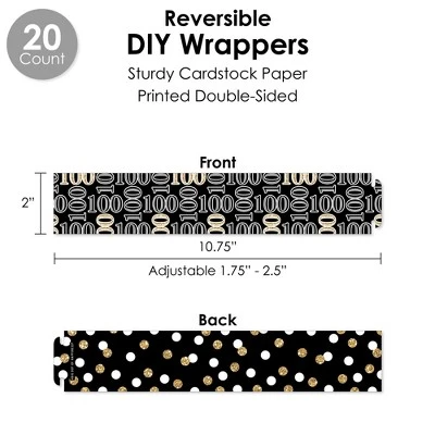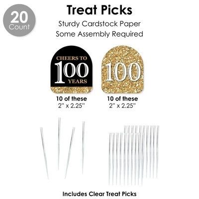 DIY WRAPPERS includes: 20 total reversible wrappers that are 10.75″ wide x 2″ tall. When wrapped, they can accommodate favors 1.75″ to 2.5″ in diameter. Professionally printed double-sided on sturdy cardstock paper, these wrappers for a Birthday Celebration are easy to secure on a variety of items like beverage containers, vases, napkins, and more by wrapping around and sliding the tab into the appropriate slit. CUPCAKE WRAPPERS includes: 20 adjustable cupcake wrappers 1.75″ – 2.5″ wide x 1.75″ tall. Professionally printed double-sided on sturdy cardstock paper, Adult 100th Birthday cupcake wrappers will fit over cupcake liners on standard and medium-sized cupcakes and are reversible for a coordinated look. Secure cupcake wrappers by sliding the tab into appropriate slit. TREAT PICKS includes: 20 cut-outs 2″ wide x 2.25″ tall & clear treat picks 4″ tall. Gold paper cut-outs come in 2 designs. Assembly stickers are included for easy DIY required assembly. FAVOR GIFT TAGS includes: 20 gift tags 3.5″ wide by 2.75″ tall & satin ribbon. Professionally printed double-sided on sturdy cardstock paper, write a special message on the back side of Adult 100th Birthday gift tags for a personal touch then attach to favors with ribbon. STRAW DECOR includes 20 cut-outs with 2 designs10 of each, size 2.25″ wide by 2.25″ tall and chevron striped paper straws – 7.75″ tall. Shaped cut-outs are professionally printed on sturdy cardstock paper. For easy assembly, create your stylish drinks by attaching Gold shaped cut-outs to paper straws with clear stickers included. Favor party pack is designed and manufactured at our Wisconsin facility using materials that are Made in the USA. Adult 100th Birthday favor pack uses a No-Mess Glitter Print: Our party kits are designed with a printed image of glitter, eliminating glitter flake while maximizing bling effect!