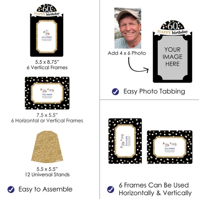 Adult 60th Birthday – Gold Paper Photo Frames includes a set of 12 picture frames with stand that are suitable for 4×6 photographs. Six vertical frames come with a round shaped top and the other six frames come in a standard rectangular shape that can be displayed horizontally or vertically. Decorative Display: Show off your guest of honor’s photos with the Adult 60th Birthday – Gold paper frames. Paper photo frames are perfect for displaying pictures on bookshelves, welcome tables, tablescape centerpieces, and fireplace mantel decorations. Easy Assembly: Attach the stand to the frame by inserting the tabs into corresponding slots. Next, fold the sides of the stand towards the center and fold down the support piece of the stand until it rests in the notches. Finally, secure your photos using the corner tabs! High-Quality Supply: Adult 60th Birthday – Gold paper frames are professionally printed double-sided on heavy-duty cardstock paper with a photo-like shine. Frame with round top measures 5.5 inches wide by 8.75 inches tall. Standard rectangle frame measures 7.5 inches wide by 5.5 inches tall. Each stand measures 5.5 inches wide by 5.5 inches tall. Made In The USA: Adult 60th Birthday – Gold Paper Photo Frames are designed and manufactured at our Wisconsin facility using materials that are Made in the USA. Adult 60th Birthday – Gold Paper Frames uses a No-Mess Glitter Print: Our Frames are designed with a printed image of glitter, eliminating glitter flake while maximizing bling effect!