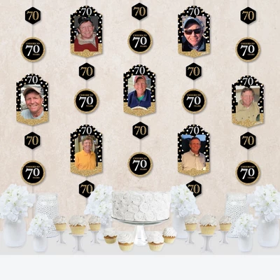 Big Dot of Happiness Adult 70th Birthday – Gold Hanging Vertical Photo Garland includes 35 shaped pieces, 1 roll of clear cording, and assembly stickers that you can use to transform your Birthday Party into an unforgettable celebration. With the 10 double-sided photo frames, insert 4 x 6 portrait photos of your guest of honor into the front and back sides. You can display up to 20 pictures using the multiple tabs to secure them into place, allowing your photo garland to look great from all angles. Delightful Decor: Adult 70th Birthday – Gold Vertical Garland can be displayed at any length you choose for a dynamic look at your celebration. You can create a backdrop, hang it from the ceiling, or attach it above your dessert table—the possibilities are endless. DIY Assembly: Start by placing your 4 x 6 portrait pictures on the front and back sides of the photo frame cut-out pieces. Then, plan your display by laying the cut-out pieces on a flat surface. Interlock the clear cording into each cut-out piece and secure it with the provided clear stickers. Instructions are also included on the packaging. High-Quality Supply: Adult 70th Birthday – Gold vertical hanging garland pieces are professionally printed double-sided on heavy-duty cardstock paper. Photo frames measure 5.5 inches wide x 9.25 inches tall. Circle pieces measure 4.25 inches in diameter. Hexagon cut-outs measure 3 inches wide by 3.25 inches tall. Made In The USA: Adult 70th Birthday – Gold Photo Vertical Garlands are designed and manufactured at our Wisconsin facility using materials that are Made in the USA. Adult 70th Birthday – Gold Garland Cut-Outs use a No-Mess Glitter Print: Our garland cut-outs are designed with a printed image of glitter, eliminating glitter flake while maximizing bling effect!