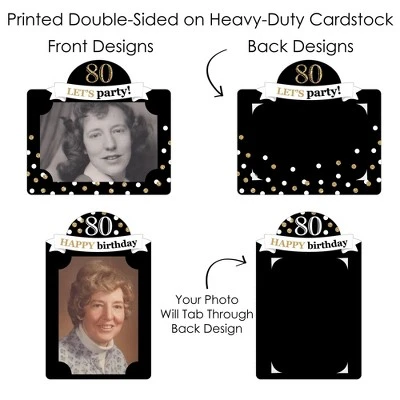 Adult 80th Birthday – Gold Photo Table Toppers INCLUDE: 15 sturdy and professionally printed paper photo holders and 15 table topper sticks. Each photo holder has pre-cut tabs to display your 4×6 photos vertically or horizontally. Clear stickers are included to easily assemble the stick to photo holder. DIY CENTERPIECE STICKS: Create picture-perfect centerpieces for your birthday party with Adult 80th Birthday – Gold Photo Table Toppers. Each photo holder has 4 pre-cut slits to tab your 4×6 photos in place. (Note: Your photo will tab through back design of photo holder.) Then attach one table topper stick to one completed photo holder piece with the included clear stickers. EASY BIRTHDAY DECOR: Adult 80th Birthday – Gold Photo Table Topper decorations can be used as centerpieces when attached to the included sticks and inserted into vases or floral arrangements. They easily accent your birthday party candy buffet when you add them to apothecary jars. Photo Table Toppers are a great addition to any birthday party and a fun way to proudly show off the guest of honor. PREMIUM PARTY DECORATION: Adult 80th Birthday – Gold Photo Table Toppers are professionally printed double-sided on heavy-duty cardstock paper. This set of paper picture frames includes 10 count vertical photo display SIZE 5.5 inches wide x 8.75 inches tall and 5 count horizontal photo display SIZE 7.5 inches wide x 6.75 inches tall. Each photo holder fits your own 4×6 photo size. The included 15 table topper sticks each SIZE 12 inches tall. Do-it-yourself assembly required. MADE IN THE USA: Adult 80th Birthday – Gold Birthday Photo Table Toppers are designed and manufactured at our Wisconsin facility using materials that are Made in the USA. Adult 80th Birthday – Gold Photo Table Toppers uses a No-Mess Glitter Print: Our Photo Holders are designed with a printed image of glitter, eliminating glitter flake while maximizing bling effect!