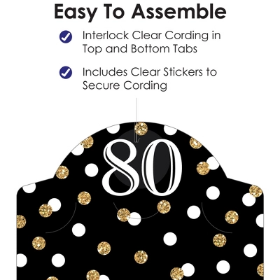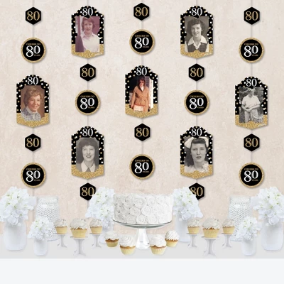 Big Dot of Happiness Adult 80th Birthday – Gold Hanging Vertical Photo Garland includes 35 shaped pieces, 1 roll of clear cording, and assembly stickers that you can use to transform your Birthday Party into an unforgettable celebration. With the 10 double-sided photo frames, insert 4 x 6 portrait photos of your guest of honor into the front and back sides. You can display up to 20 pictures using the multiple tabs to secure them into place, allowing your photo garland to look great from all angles. Delightful Decor: Adult 80th Birthday – Gold Vertical Garland can be displayed at any length you choose for a dynamic look at your celebration. You can create a backdrop, hang it from the ceiling, or attach it above your dessert table—the possibilities are endless. DIY Assembly: Start by placing your 4 x 6 portrait pictures on the front and back sides of the photo frame cut-out pieces. Then, plan your display by laying the cut-out pieces on a flat surface. Interlock the clear cording into each cut-out piece and secure it with the provided clear stickers. Instructions are also included on the packaging. High-Quality Supply: Adult 80th Birthday – Gold vertical hanging garland pieces are professionally printed double-sided on heavy-duty cardstock paper. Photo frames measure 5.5 inches wide x 9.25 inches tall. Circle pieces measure 4.25 inches in diameter. Hexagon cut-outs measure 3 inches wide by 3.25 inches tall. Made In The USA: Adult 80th Birthday – Gold Photo Vertical Garlands are designed and manufactured at our Wisconsin facility using materials that are Made in the USA. Adult 80th Birthday – Gold Garland Cut-Outs use a No-Mess Glitter Print: Our garland cut-outs are designed with a printed image of glitter, eliminating glitter flake while maximizing bling effect!