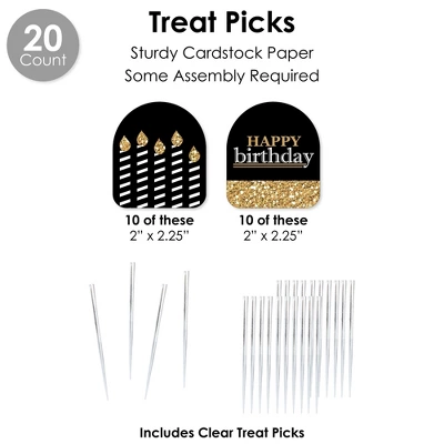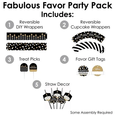 DIY WRAPPERS includes: 20 total reversible wrappers that are 10.75″ wide x 2″ tall. When wrapped, they can accommodate favors 1.75″ to 2.5″ in diameter.These wrappers for a Birthday Party are easy to secure on a variety of items! CUPCAKE WRAPPERS includes: 20 adjustable cupcake wrappers 1.75″ – 2.5″ wide x 1.75″ tall. Adult Happy Birthday – Gold cupcake wrappers will fit over cupcake liners on standard and medium-sized cupcakes and are reversible for a coordinated look. Secure cupcake wrappers by sliding the tab into appropriate slit. TREAT PICKS includes: 20 cut-outs 2″ wide x 2.25″ tall & clear treat picks 4″ tall. Gold Themed paper cut-outs come in 2 designs. Assembly stickers are included for easy DIY required assembly. FAVOR GIFT TAGS includes: 20 gift tags 3.5″ wide by 2.75″ tall & satin ribbon.Write a special message on the back side of Adult Happy Birthday – Gold gift tags for a personal touch then attach to favors with ribbon. STRAW DECOR includes 20 cut-outs with 2 designs10 of each, size 2.25″ wide by 2.25″ tall and chevron striped paper straws – 7.75″ tall. Shaped cut-outs are professionally printed on sturdy cardstock paper. For easy assembly, create your stylish drinks by attaching Gold Themed shaped cut-outs to paper straws with clear stickers included. Favor party pack is designed and manufactured at our Wisconsin facility using materials that are Made in the USA. Adult Happy Birthday – Gold favor pack uses a No-Mess Glitter Print: Our party kits are designed with a printed image of glitter, eliminating glitter flake while maximizing bling effect!
