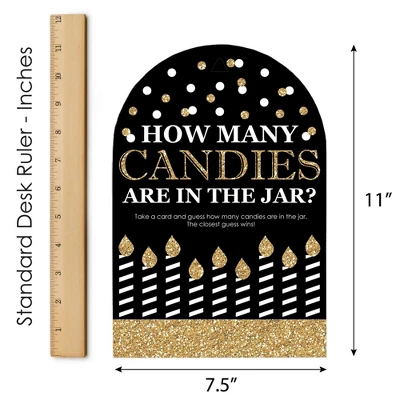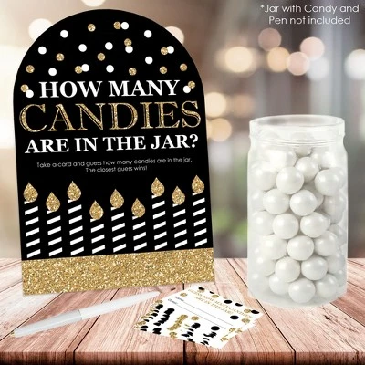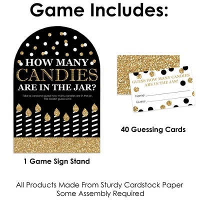 Adult Happy Birthday Candy Guessing Game INCLUDES 1 sign with a built-in stand and 40 guessing cards that will look great at your Birthday Party. Sign measures 7.5β wide by 11β tall and cards measure 3.5β by 2.25β tall. Candy and jar are not included. HOW TO PLAY: Draw attention to your candy jar with the Adult Happy Birthday Candy Guessing Game! Place the sign and cards next to your candy jar. Guests can then take a card and guess how many candies are in the jar. The closest guess wins! EASY ASSEMBLY: To use, fold the sides of the stand towards the center. Then, fold down the support piece of the stand until it rests in the notches. Finally, display your Black and Gold sign next to your container of candy. HIGH-QUALITY SUPPLY: Adult Happy Birthday Candy Guessing Game is professionally printed double-sided on sturdy cardstock paper with a photo-like shine. They are individually inspected and then carefully packaged by hand. Sign arrives flat with some easy assembly required. MADE IN THE USA: Adult Happy Birthday Candy Guessing Game is designed and manufactured at our Wisconsin facility using materials that are Made in the USA. Adult Happy Birthday Candy Guessing Games uses a No-Mess Glitter Print: Our signs and cards are designed with a printed image of glitter, eliminating glitter flake while maximizing bling effect!
