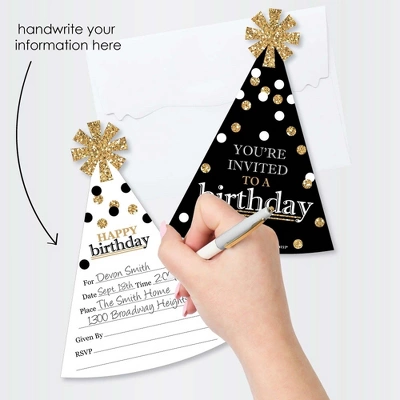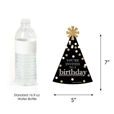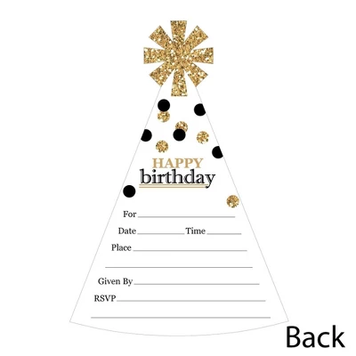 Adult Happy Birthday – Gold Fill-In the Blank Invitation Set INCLUDES 12 cone hat party invitations and 12 premium white envelopes. Adult Happy Birthday – Gold fill-in invitations are perfect for any event. The black and gold theme are great for a birthday party. Adult Happy Birthday – Gold party invitations SIZE 5 inches by 7 inches. The included envelopes measure 5 inches by 7 inches. The back of each Adult Happy Birthday – Gold party invitation has space to add your party details: For: Date: Time: Place: Given By: RSVP: PREMIUM PARTY INVITATIONS: Cone hat party invitations are professionally printed on heavy-duty card stock paper with a photo-like shine. They are individually inspected, then carefully packaged with our exclusive squiggle flap envelopes, making this Adult Happy Birthday – Gold stationary set a must-have for any birthday party. MADE IN THE USA: Adult Happy Birthday – Gold – Birthday Party Shaped Invitations are designed and manufactured at our Wisconsin facility using materials that are Made in the USA. Adult Happy Birthday Fill-In Invitations use a No-Mess Glitter Print: Our invitations are designed with a printed image of glitter, eliminating glitter flake while maximizing bling effect!