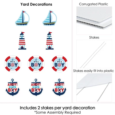 Outdoor Boy Lawn Decorations INCLUDES 10 coordinating Ahoy It’s a Boy yard decorations: 2 Shape 2; 2 Shape 4; 3 Shape 1; 3 Shape 3 and 20 sturdy stakes for displaying. PERFECT FOR ANY LOCATION! Ahoy It’s a Boy Yard Signs SIZE Shape 2 ~ 9.25″ x 10.25″; Shape 4 ~ 5″ x 11″; Shape 1 ~ 11″ x 11″; Shape 3 ~ 9.75″ x 12.25″ . Vibrant nautical yard decor is an easy way to decorate to be baby shower. Both adults and kids will love these nautical party supplies. Display in front yards of your home or party venue. EASY TO USE: Nautical Lawn Decorations are professionally printed and cut, making assembly quick and easy. Simply insert two heavy-duty stakes into each yard ornament and press into the ground to display. HIGH-QUALITY YARD DECORATIONS: Ahoy It’s a Boy – Lawn Yard Signs are professionally printed on durable, corrugated plastic. 10-Piece yard decorations are waterproof and can be used outdoors. Nautical lawn decor can be displayed in wind, snow and rain without any worry. MADE IN THE USA: Ahoy It’s a Boy – Lawn Decorations – Outdoor Baby Shower Yard Decorations are designed and manufactured at our Wisconsin facility using materials that are Made in America.