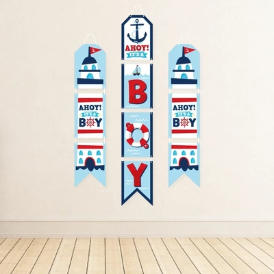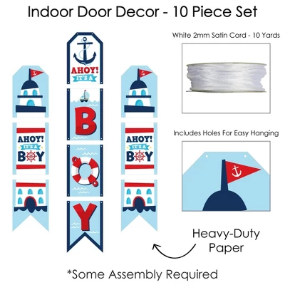 Ahoy It’s a Boy Indoor Door Decor INCLUDES: 10 heavy-duty paper pieces to create 3 vertical banners and 10 yards white 2mm satin cord. Easy assembly required. FUN PARTY BANNER: Vertical hanging door banners will create that wow-factor at your nautical baby shower. Hang at the entrance of your event, over the food or gift table, or any open wall space to create a fun focal point. WALL DECORATION KIT: All banner sign pieces SIZE 7.5 inches wide x 10.75 inches. Each piece has pre-cut holes for easy DIY hanging with the included 10 yards of white 2mm satin cord. This DIY banner decor kit allows you to choose the spacing between each piece and string the cording through at your desired length. Clear adhesive stickers are also included to secure cording onto the back of each banner piece. PREMIUM PARTY SUPPLIES: Ahoy It’s a Boy hanging vertical door banner decoration pieces are professionally printed one-sided on heavy-duty cardstock paper. Each banner piece is individually inspected and carefully packaged by hand. Nautical wall decoration kit requires some easy assembly. Follow the number sequence on the back of each banner piece and simply string the included cording through the pre-cut holes. MADE IN THE USA: Ahoy It’s a Boy paper door banner decoration kit is designed and manufactured at our Wisconsin facility using materials that are Made in the USA.