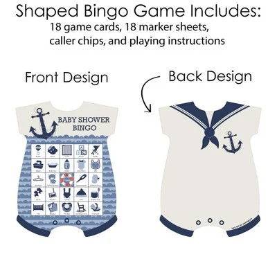Ahoy – Nautical – Shaped Picture Bingo Cards and Markers INCLUDES 18 game cards, 18 perforated marker sheets, 1 perforated call sheet, and game instructions. MUST-HAVE PARTY SUPPLY: Bingo is an easy and classic baby shower game that everyone will have fun playing. Ahoy – Nautical – Shaped Picture Bingo Cards and Markers give this classic game a fresh look with baby bodysuit-shaped playing cards and baby related pictures instead of numbers. HOW TO PLAY: Begin play by the designated bingo leader pulling a caller chip from the bowl. Each guest covers the called picture on their card with square marker. Continue until a guest has covered a row of pictures in any direction – vertically, horizontally, or diagonally and calls out “BINGO!”. HIGH-QUALITY: Ahoy – Nautical Picture Shaped Bingo Cards and Markers are professionally printed and double-sided on sturdy cardstock paper. They are individually inspected and carefully packaged by hand. Each baby bodysuit-shaped card measures 5.25″ Wide x 6.75″ Tall, perforated marker sheets measure 2.75″ Wide x 5″ Tall and individual markers measure 0.75″ Wide x 0.75″ Tall. MADE IN THE USA: Ahoy – Nautical – Shaped Bingo Cards and Markers are designed and manufactured at our Wisconsin facility using materials that are Made in the USA.
