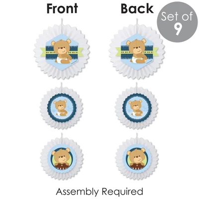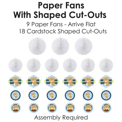 Baby Boy Teddy Bear Paper Fans INCLUDES 9 Paper Fans, 18 Shaped Cut-Outs, and Assembly Stickers. Easy set up with all the necessary items included. These decorative fans will surely make your next Baby Shower memorable. FESTIVE FUN: Diapered Teddy Bear Paper Fans Tissue Decoration Kit are versatile in use for any Baby Shower. You can hang them from the ceiling, on the walls, or over a mantelpiece. EASY DIY ASSEMBLY: Baby Boy Teddy Bear Paper Fans require some assembly before use. Start by removing the plastic strip from the tape. Unfold the fan, pressing its two ends together firmly to form a circle. Adhere a shaped cut-out using assembly stickers in the center. Use the attached string to hang the decoration. PREMIUM DECOR: Shaped cut-outs featured in the Diapered Teddy Bear Paper Fans Tissue Decoration Kit are professionally printed on heavy-duty paper with a photo-like shine. All items are individually inspected and carefully packaged. Fans arrive flat and require easy assembly. MADE IN THE USA: Baby Boy Teddy Bear Paper Fans are designed and manufactured at our Wisconsin facility using materials that are Printed in the USA – Fans Made in China.