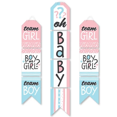 Baby Gender Reveal Indoor Door Decor INCLUDES: 10 heavy-duty paper pieces to create 3 vertical banners and 10 yards white 2mm satin cord. Easy assembly required. FUN PARTY BANNER: Vertical hanging door banners will create that wow-factor at your He or She Baby Shower Party. Hang at the entrance of your event, over the food or gift table, or any open wall space to create a fun focal point. WALL DECORATION KIT: All banner sign pieces SIZE 7.5 inches wide x 10.75 inches. Each piece has pre-cut holes for easy DIY hanging with the included 10 yards of white 2mm satin cord. This DIY banner decor kit allows you to choose the spacing between each piece and string the cording through at your desired length. Clear adhesive stickers are also included to secure cording onto the back of each banner piece. PREMIUM PARTY SUPPLIES: Baby Gender Reveal hanging vertical door banner decoration pieces are professionally printed one-sided on heavy-duty cardstock paper. Each banner piece is individually inspected and carefully packaged by hand. Blue & Pink wall decoration kit requires some easy assembly. Follow the number sequence on the back of each banner piece and simply string the included cording through the pre-cut holes. MADE IN THE USA: Baby Gender Reveal paper door banner decoration kit is designed and manufactured at our Wisconsin facility using materials that are Made in the USA.