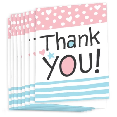 Baby Gender Reveal note cards SIZE 5.5 inches by 3.75 inches, folded. The included envelopes measure 5.75 inches by 3.75 inches. The inside of each Baby Gender Reveal thank you card stationery has a fun graphic as well as space to write a special note to friends and family. PREMIUM THANK YOU CARDS: Baby Gender Reveal thank you cards are professionally printed on heavy-duty card stock paper with a photo-like shine. They are hand-folded and individually inspected, then carefully packaged with our exclusive squiggle flap envelopes, making this Blue & Pink stationary set a must-have for Team Boy or Girl Party. MADE IN THE USA: Baby Gender Reveal He or She Baby Shower Party Thank You Cards are designed and manufactured at our Wisconsin facility using materials that are Made in the USA.