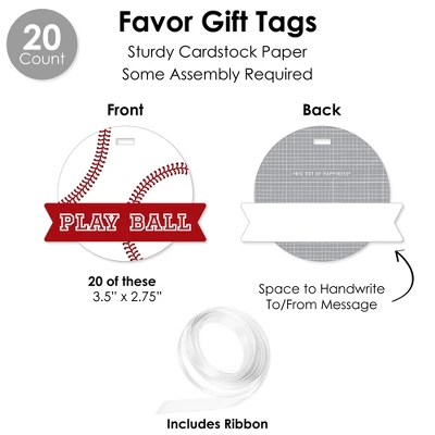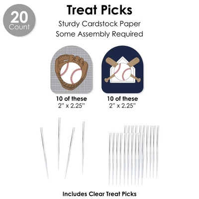 DIY WRAPPERS includes: 20 total reversible wrappers that are 10.75” wide x 2” tall. When wrapped, they can accommodate favors 1.75” to 2.5” in diameter. Professionally printed double-sided on sturdy cardstock paper, these wrappers for a Birthday or Baby Shower Party are easy to secure on a variety of items like beverage containers, vases, napkins, and more by wrapping around and sliding the tab into the appropriate slit. CUPCAKE WRAPPERS includes: 20 total cupcake wrappers that adjust to fit 1.75” – 2.5” wide x 1.75” tall. Professionally printed double-sided on sturdy cardstock paper, Batter Up – Baseball cupcake wrappers will fit over cupcake liners on standard and medium-sized cupcakes and are reversible for a coordinated look. Secure cupcake wrappers by sliding the tab into appropriate slit. TREAT PICKS includes: 20 total shaped cut-outs – 2” wide x 2.25” tall and clear treat picks – 4” tall. Sports Themed paper cut-outs come in 2 designs that are a great for styling food being served. Assembly stickers are included for easy DIY required assembly. FAVOR GIFT TAGS includes: 20 total gift tag paper cut-outs – 3.5” wide by 2.75” tall and satin ribbon. Professionally printed double-sided on sturdy cardstock paper, write a special message in the blank space on the back side of Batter Up – Baseball gift tags for a personal touch. For easy assembly, attach to party favors with the ribbon. STRAW DECOR includes 20 total shaped cut-outs with 2 designs -10 count each, size 2.25” wide by 2.25” tall and chevron striped paper straws – 7.75” tall. Shaped cut-outs are professionally printed on sturdy cardstock paper. For easy assembly, create your stylish drinks by attaching Sports Themed shaped cut-outs to paper straws with clear stickers included. Favor party pack is designed and manufactured at our Wisconsin facility using materials that are Made in the USA.