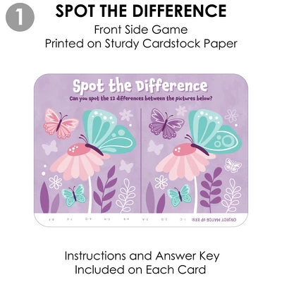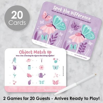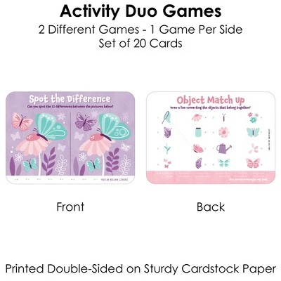 Big Dot of Happiness Beautiful Butterfly Activity Duo Games INCLUDES set of 20 Floral Baby Shower or Birthday Party activity cards. Each card comes with 2 different games – 1 game per side. Instructions and answer keys included on each card. Festive Fun: Add some entertainment to your celebration when you pass out the 2-in-1 Beautiful Butterfly activity cards. Each card is easy to handwrite on and features games Spot The Difference and Object Match Up. How To Play: Each game card is printed with easy-to-follow game instructions and requires a pen or pencil. For added fun, make each game competitive by adding a time limit and offering a prize to the winning party guest. High-Quality Supply: Beautiful Butterfly cards are professionally printed double-sided on heavy-duty cardstock paper with a photo-like shine. Each Rectangle-shaped card measures 7″ wide by 5″ tall. This game set will arrive ready to play. Made In The USA: Beautiful Butterfly Activity Duo Games are designed and manufactured at our Wisconsin facility using materials that are Made in the USA. Beautiful Butterfly Activity Cards uses a No-Mess Glitter Print: Our cards are designed with a printed image of glitter, eliminating glitter flake while maximizing bling effect!