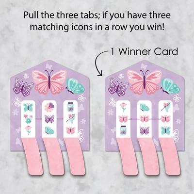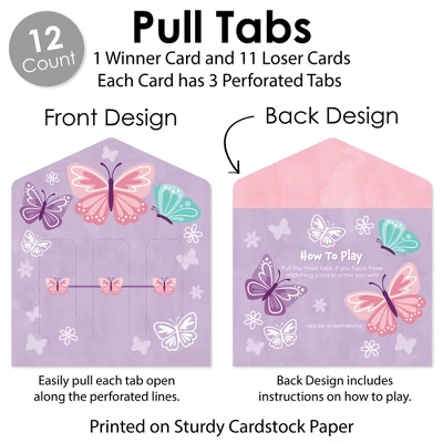 Beautiful Butterfly Pull Tabs 3-in-a-Row Includes 12 pull tab game cards with 1 winning card and 11 losing cards. Great for a Floral Baby Shower or Birthday Party, these game cards are for entertainment purposes only. Fun For All: The Beautiful Butterfly 3-in-a-Row pickle cards can be played by children and adults. It’s the perfect way to add excitement to your event! Prize is determined by the event host. How to Play: Hand out one Pull Tab Game Card to each player. Players will then pull each tab open along the perforated lines. If there are three matching icons in a row, the player wins! High-Quality: Pink and Purple Pull Tabs 3-in-a-Row Cards are professionally printed double-sided on sturdy cardstock paper with a photo-like shine. They are individually inspected and carefully packaged by hand. Made in the USA: Beautiful Butterfly Pull Tabs 3-in-a-Row is designed and manufactured at our Wisconsin facility using materials that are Made in the USA.