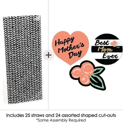 Best Mom Ever Straw Decor INCLUDES 24 Mother’s Day paper cut outs, 24 coordinating paper straws, and clear stickers for easy assembly. Best Mom Ever DIY party supplies are perfect for a Mother’s Day Party. Best Mom Ever Straw Decor party kit SIZE 6 – “Happy Mother’s Day” Hearts (2.5″ x 2.5″), 12 – “Best Mom Ever” Circles (2.25″ x 2.25″), 6 – Flowers (2.5″ x 2″), and 24 chevron striped paper straws 7.75″ tall. EASY PARTY DECORATIONS: Best Mom Ever straw decor will add a touch of style to your Mother’s Day party tables. Best Mom Ever straw decor will also look great at your beverage bar. Use these adorable Mother’s Day party accessories as straws or swizzle sticks. The paper straws can also be cut in half and used as cupcake picks once the shaped cut out is attached. PREMIUM PARTY SUPPLIES: Best Mom Ever paper cut out straw decorations are professionally printed on heavy-duty cardstock paper with a photo-like shine. They are individually inspected and carefully packaged by hand, along with coordinating paper straws. Best Mom Ever Straw Decor will require some easy assembly. Simply adhere the shaped cut outs to the straws using the included clear stickers. Get creative with your DIY Mother’s Day party decoration ideas! Please Note: Mason Jars shown for display purposes and are not included.
