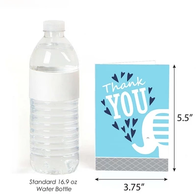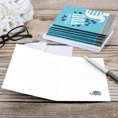 Blue Elephant Thank You Note Card Set INCLUDES 8 elephant boy party thank yous and premium white envelopes. Blue Elephant thank you notes are perfect for any event. The elephant boy theme is great for a baby shower or birthday party. Blue Elephant note cards SIZE 5.5 inches by 3.75 inches, folded. The included envelopes measure 5.75 inches by 3.75 inches. The inside of each Blue Elephant thank you card stationery has a fun graphic as well as space to write a special note to friends and family. PREMIUM THANK YOU CARDS: Blue Elephant thank you cards are professionally printed on heavy-duty card stock paper with a photo-like shine. They are hand-folded and individually inspected, then carefully packaged with our exclusive squiggle flap envelopes, making this elephant boy stationary set a must-have for baby shower or birthday parties. MADE IN THE USA: Blue Elephant – Baby Shower or Birthday Party Thank You Cards are designed and manufactured at our Wisconsin facility using materials that are Made in the USA.