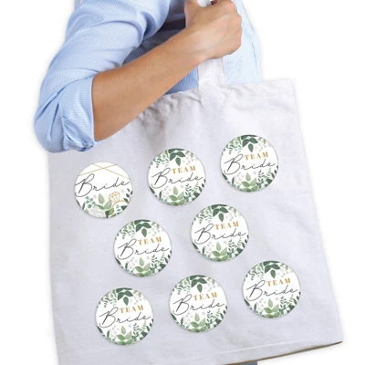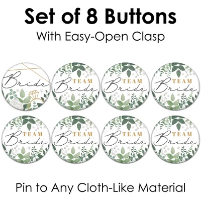 Boho Botanical Bride Pinback Buttons INCLUDES 8 sturdy, round pinback buttons. Each set of 8 Greenery buttons arrives assembled and ready for showing the world your special message. MESSAGES MADE-EASY: Boho Botanical Bride Pinback Buttons are round-shaped, measuring 3 inches in diameter. Each set includes 1 Boho Botanical āBrideā and 7 āTeam Brideā, easy-to-wear buttons; perfect for making a statement! Pass out to your group at bachelorette, wedding parties, bridal showers, and special gatherings, or hand out individually. ORIGINAL BUTTON SET: These fully assembled buttons have a metal shell with an easy-open, straight metal clasp backer. You can pin easily onto any cloth-like materials such as canvas tote bags, jackets, shirts, backpacks, and hats! Designed to be trendy and stylish, this set of 8 full-color buttons will get all the attention. STURDY AND DURABLE: Boho Botanical Bride Pinback Buttons are made with sturdy, metal backers and shells with a glossy finish. Buttons are reusable and can easily be cleaned as needed. MADE IN THE USA: Boho Botanical Bride Pinback Buttons are designed and manufactured at our Wisconsin facility using materials that are Made in the USA.