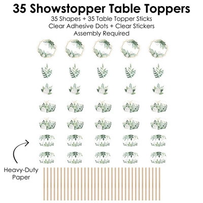 Boho Botanical Showstopper Table Toppers INCLUDE: 35 heavy-duty paper centerpiece cut-outs in our Greenery theme. Each cut-out shape is printed double-sided and includes 35 wooden dowel sticks. DIY assembly is required. EASY TABLE DECORATIONS: Boho Botanical showstopper party centerpieces come with a variety of fun shapes and in the perfect sizes to create impressive tabletop decorations. Place assembled centerpiece sticks into jars or floral arrangements for that showstopper wow-factor. DIY PARTY CENTERPIECES: Boho Botanical party centerpiece kit arrives with wooden dowels and reinforcing stickers for easy DIY assembly. Simply press the included reinforcing sticker onto one dowel stick, near the end of dowel. Then, firmly press dowel to the back of a table topper shape. HIGH-QUALITY PARTY SUPPLIES: Greenery showstopper table toppers are professionally printed double-sided on sturdy cardstock paper with a photo-like shine. They are individually inspected and carefully packaged by hand. Showstopper table toppers will arrive unassembled, leaving your DIY Baby & Bridal Shower or Wedding idea options endless. MADE IN THE USA: Boho Botanical showstopper table toppers are designed and manufactured at our Wisconsin facility using materials that are Made in the USA.