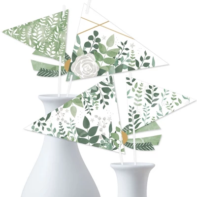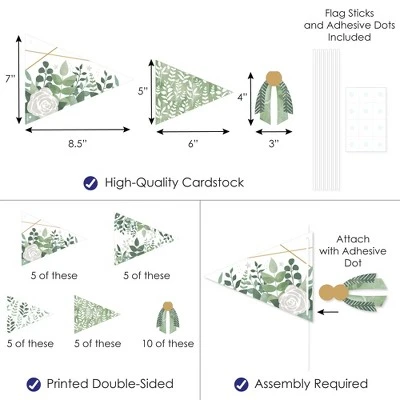 Big Dot of Happiness Boho Botanical Pennant Flag Centerpieces include a set of 20 paper triangle flags, 10 paper tassel shapes, paper sticks, and adhesive dots. Pennant centerpieces will help create an impressive look at your Greenery Party. Party Decor: Make a statement with the Boho table decorations at your celebration. Insert them into vases or Boho arrangements and place them at the center of your tablescape. They are the perfect way to accent your tables and are also a great addition to any photo booth. Easy DIY: Boho Botanical flag decorations come with sticks and adhesive dots for easy assembly. Simply insert a stick into the holes on the side of a pennant triangle and attach a paper tassel with an included adhesive dot. Then, begin arranging your centerpiece decorations! High-Quality Supply: Boho Botanical flags are professionally printed double-sided on heavy-duty cardstock paper with a photo-like shine. Large pennants measure 8.5 inches wide by 7 inches tall, small pennants measure 6 inches wide by 5 inches tall, and paper tassels measure 3 inches wide by 4 inches tall. Assembled In The USA: Boho Botanical Pennant Flag Centerpieces are designed and manufactured at our Wisconsin facility using materials that are Made in the USA – Sticks Made in China.