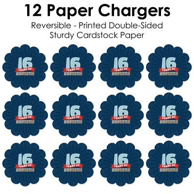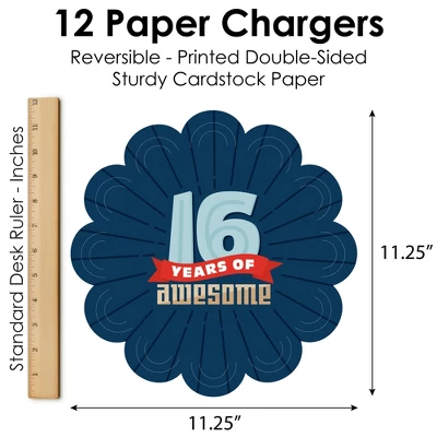 Boy 16th Birthday Paper Chargers INCLUDES set of 12 reversible round table decorations. Create an exciting look at your Sweet Sixteen Birthday Party when you use paper chargers to elevate your table setting and accent your dinnerware. Tablescape Accent: Boy 16th Birthday chargers will add a festive flare to your tablescape. Whether it’s a large feast gathering or a close-knit gathering with the family, paper chargers will add a splash of color and are a great alternative to paper doilies. Easy Decor: Dress up your table with layers! Add a plate to the center of paper chargers. Blue Themed paper charger is an easy solution for your table setting decor and perfect for complementing your tableware. The scallop border can be flared up for an elevated look and the backside can be used for an alternate look. High-Quality Supply: Boy 16th Birthday Paper Chargers are professionally printed double-sided on sturdy cardstock paper with a photo-like shine. Paper chargers measure 11.25” in diameter and are the perfect final touch to complete your Sweet Sixteen Birthday Party. Made In The USA: Boy 16th Birthday Paper Chargers are designed and manufactured at our Wisconsin facility using materials that are Made in the USA.