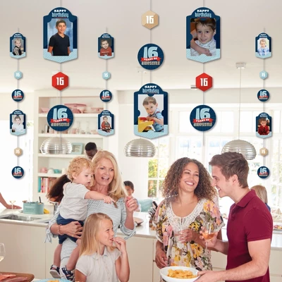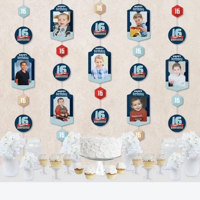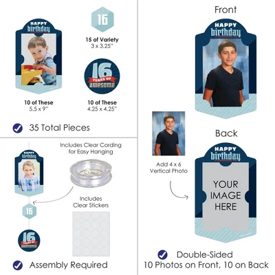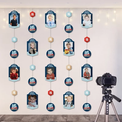 Big Dot of Happiness Boy 16th Birthday Hanging Vertical Photo Garland includes 35 shaped pieces, 1 roll of clear cording, and assembly stickers that you can use to transform your Birthday Party into an unforgettable celebration. With the 10 double-sided photo frames, insert 4 x 6 portrait photos of your guest of honor into the front and back sides. You can display up to 20 pictures using the multiple tabs to secure them into place, allowing your photo garland to look great from all angles. Delightful Decor: Boy 16th Birthday Vertical Garland can be displayed at any length you choose for a dynamic look at your celebration. You can create a backdrop, hang it from the ceiling, or attach it above your dessert table—the possibilities are endless. DIY Assembly: Start by placing your 4 x 6 portrait pictures on the front and back sides of the photo frame cut-out pieces. Then, plan your display by laying the cut-out pieces on a flat surface. Interlock the clear cording into each cut-out piece and secure it with the provided clear stickers. Instructions are also included on the packaging. High-Quality Supply: Boy 16th Birthday vertical hanging garland pieces are professionally printed double-sided on heavy-duty cardstock paper. Photo frames measure 5.5 inches wide x 9.25 inches tall. Circle pieces measure 4.25 inches in diameter. Hexagon cut-outs measure 3 inches wide by 3.25 inches tall. Made In The USA: Boy 16th Birthday Photo Vertical Garlands are designed and manufactured at our Wisconsin facility using materials that are Made in the USA.