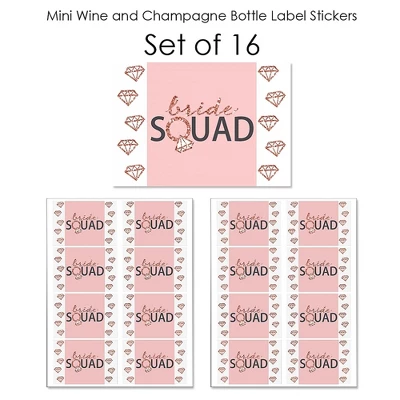 Bride Squad Mini Wine and Champagne Bottle Labels INCLUDES Set of 16 rose gold single-serve bottle sticker labels in the Bride Squad theme, perfect for a bridal shower or bachelorette party gift. Mini wine and champagne bottle label each SIZE 3.75 inches wide x 2.6 inches tall to fit small, single-serve bottles. EASY TO USE: Prepare your beverage bottles by ensuring they are room temperature. Removing the original bottle label is not necessary. Carefully peel one adhesive Bride Squad Mini Wine Bottle Label from the backing and adhere to a bottle, starting at the left edge and rolling to the opposite edge. Press down to smooth. HIGH QUALITY PARTY FAVORS: Bride Squad mini wine and champagne bottle labels are professionally printed on a sticker paper with a glossy coating. They are waterproof and can be used on bottles that will be chilled, just be sure to apply prior to chilling. Add them single-serve bottles at each place setting for an impressive, coordinated bridal shower or bachelorette party gift. UNIQUE GIFT IDEA: Bride Squad Mini Wine Bottle Labels also make a great gift idea. Add Mini Wine and Champagne Bottle Label Stickers to a variety of single-serve wine and spirits bottles for a special gift or party game winner prize. Wine bottle labels will easily give you bridal shower or bachelorette party a personal touch! MADE IN THE USA: Bride Squad Mini Wine and Champagne Bottle Label Stickers are made at our Wisconsin facility using materials that are Made in the USA. Please Note: Mini bottles in image are not included. Mini Wine and Champagne Bottle Labels No-Mess Glitter Print: Our beverage labels are designed with a printed image of glitter, eliminating glitter flake while maximizing bling effect!