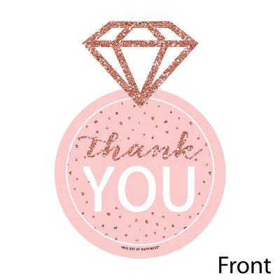 Shaped Thank You Cards Set INCLUDES 12 Bride Squad bridal shower or bachelorette party thank you cards and 12 premium white envelopes. Ring Shaped Thank You Cards are the perfect end to any event. Ring party thank you note cards SIZE 5 inches by 7 inches. The included envelopes measure to fit 5 inches by 7 inches cards. The back of each Bride Squad bridal shower or bachelorette party thank you has space to write a personal message of thanks. The back of each Bride Squad bridal shower or bachelorette party thank you has space to write a personal message of thanks. MADE IN THE USA: Bride Squad Party Thank You Cards are designed and manufactured at our Wisconsin facility using materials that are Made in America. Rose Gold Thank You Cards use a No-Mess Glitter Print: Our invitations are designed with a printed image of glitter, eliminating glitter flake while maximizing bling effect!