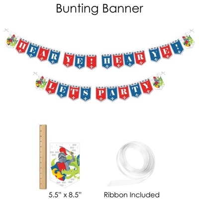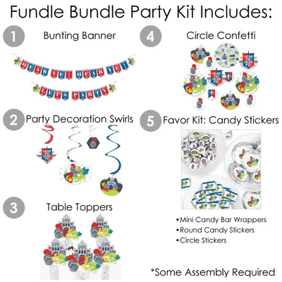 BUNTING BANNER includes: letter and themed pennants. Each pennant measures 8.5″ high x 5.5″ wide. Pennants are numbered in sequence and ribbon is included for easy assembly. PARTY DECORATION SWIRLS includes: 4 different shapes, 10 count per shape, that hang below an accordion-style spiral. Professionally printed double-sided, each decoration swirl in the 40-piece set has a pre-cut hole for easy assembly using the included clear hooks. Party decoration swirls will arrive flat. TABLE TOPPERS includes: 15 Calling All Knights and Dragons centerpiece sticks in three different shapes, each professionally printed double-sided. To use as centerpieces or photo props, wooden dowels and assembly stickers are included. CIRCLE CONFETTI includes: three different sizes of circles – 12 small circles, size 2.75″, 9 medium circles, size 4.25″, and 6 large circles, size 5.5″. Professionally printed double-sided with coordinating medieval designs, circle confetti can be scattered around your table. FAVOR KIT: CANDY STICKERS includes: 2 sheets mini candy bar wrappers (total 40), 2 sheets round candy stickers (total 216), 2 sheets circle stickers (total 48). Easy assembly with this peel and stick favor kit. Simply center and press stickers onto your favorite candies to style candy buffets or decorate take-home favors for party guests. Note: Candy is not included.