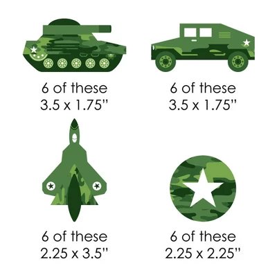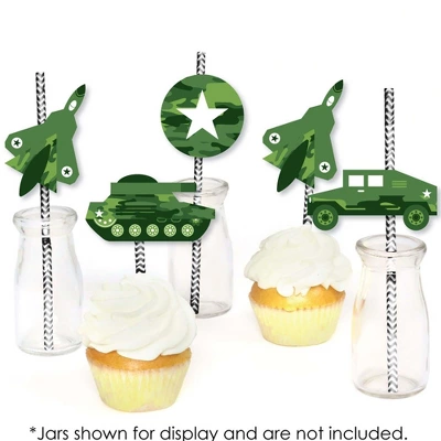 Camo Hero Straw Decor INCLUDES 24 military paper cut outs, 24 coordinating paper straws & 40 clear stickers for easy assembly. Camo Hero DIY party supplies are perfect for a baby shower or birthday. Military Straw Decor party kit SIZE 6 tank paper die cuts (3.5″ X 1.75″); 6 truck paper die cuts (3.5″ X 1.75″); 6 plane paper die cuts (2.25″ X 3.5″); 6 circle paper die cuts (2.25″ X 2.25″) and 24 chevron striped paper straws 7.75″ tall. EASY PARTY DECORATIONS: Camo Hero straw decor will add a touch of style to your baby shower or birthday party tables. Army straw decor will also look great at your beverage bar. Use these adorable camouflage party accessories as straws or swizzle sticks. The paper straws can also be cut in half and used as cupcake picks once the shaped cut out is attached. PREMIUM PARTY SUPPLIES: Camo Hero paper cut out straw decorations are professionally printed on heavy-duty card stock paper with a photo-like shine. They are individually inspected and carefully packaged by hand, along with coordinating paper straws. Military Straw Decor will require some easy assembly. Simply adhere the shaped cut outs to the straws using the included clear stickers. Get creative with your DIY baby shower or birthday party decoration ideas! Please Note: Mason Jars shown for display purposes and are not included.