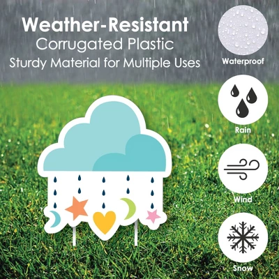 Outdoor Gender Neutral Baby Shower Lawn Decorations INCLUDES 10 coordinating Colorful Baby Shower yard decorations: 2 “Baby” Shapes, 2 Cloud Shapes, 2 Baby Bottle Shapes, 2 Pacifier Shapes, 2 Rattle Shapes, and 20 sturdy stakes for displaying. PERFECT FOR ANY LOCATION! Colorful Baby Shower Yard Signs SIZE “Baby” Shape – 14.57″ x 7″; Cloud Shape – 9.75″ x 10.5″; Baby Bottle Shape – 7.25″ x 13.25″; Pacifier Shape – 10″ x 10″; Rattle Shape – 8″ x 12.5″. Vibrant baby yard decor an easy way to decorate for the gender neutral baby shower. Both adults and kids will love these party supplies. Display in front yards of your home or party venue. EASY TO USE: Baby Bottle, Rattle, Pacifier, and Rain Cloud Lawn Decorations are professionally printed and cut, making assembly quick and easy. Simply insert two heavy-duty stakes into each gender neutral baby shower yard ornament and press into the ground to display. HIGH-QUALITY YARD DECORATIONS: Colorful Baby Shower – Lawn Yard Signs are professionally printed on durable, corrugated plastic. 10-Piece yard decorations are waterproof and can be used outdoors. Gender Neutral Baby Shower lawn decor can be displayed in wind, snow and rain without any worry. MADE IN THE USA: Colorful Baby Shower – Lawn Decorations – Outdoor Yard Decorations are designed and manufactured at our Wisconsin facility using materials that are Made in America.