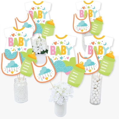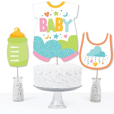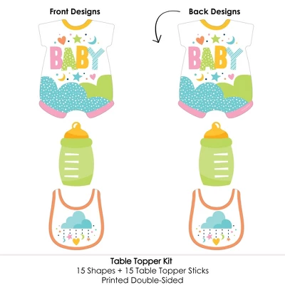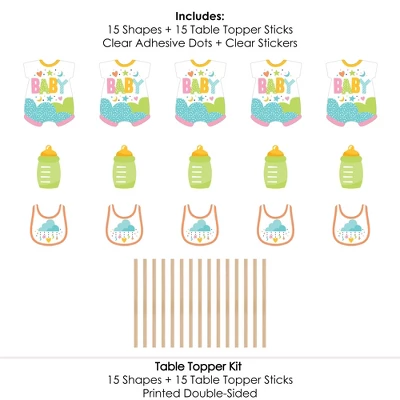 Colorful Baby Shower Centerpiece Sticks INCLUDES 15 neutral colored table toppers in three different shapes, 15 sticks and stickers for easy assembly. Rainbow party table decorations are perfect for a gender neutral baby shower. Colorful Baby Shower Centerpiece Sticks SIZE five baby bodysuit table toppers, 8.25″ wide x 10.75″ tall; five bib table toppers, 6″ wide x 6.75″ tall; and five bottle table toppers, 3.75″ wide x 7″ tall. The unique design and variety of pieces makes this table decoration kit an impressive addition to any rainbow theme party. EASY PARTY DECOR: Colorful Baby Shower table decorations can be used as centerpieces when attached to the included sticks and inserted into vases or floral arrangements. They easily accent yourrainbow candy buffet when you add them to apothecary jars. Table toppers are also a great addition to any photo booth. The large shaped cut outs will make your party pics instantly shareable. Colorful Baby Shower centerpiece sticks are sure to make a statement however you choose to use them! PREMIUM PARTY SUPPLIES: Colorful Baby Shower table toppers are professionally printed on heavy-duty cardstock paper with a photo-like shine. They are individually inspected and carefully packaged by hand with sticks and stickers for easy assembly. Get creative with your DIY party ideas! MADE IN THE USA: Colorful Baby Shower – Gender Neutral Party Centerpiece Sticks are designed and manufactured at our Wisconsin facility using materials that are Made in America.