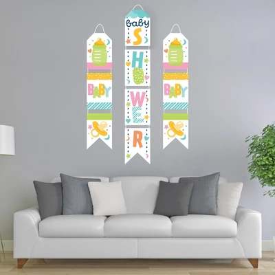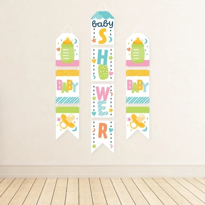 Colorful Baby Shower Indoor Door Decor INCLUDES: 10 heavy-duty paper pieces to create 3 vertical banners and 10 yards white 2mm satin cord. Easy assembly required. FUN PARTY BANNER: Vertical hanging door banners will create that wow-factor at your gender neutral baby shower. Hang at the entrance of your event, over the food or gift table, or any open wall space to create a fun focal point. WALL DECORATION KIT: All banner sign pieces SIZE 7.5 inches wide x 10.75 inches. Each piece has pre-cut holes for easy DIY hanging with the included 10 yards of white 2mm satin cord. This DIY banner decor kit allows you to choose the spacing between each piece and string the cording through at your desired length. Clear adhesive stickers are also included to secure cording onto the back of each banner piece. PREMIUM PARTY SUPPLIES: Colorful Baby Shower hanging vertical door banner decoration pieces are professionally printed one-sided on heavy-duty cardstock paper. Each banner piece is individually inspected and carefully packaged by hand. Neutral colored wall decoration kit requires some easy assembly. Follow the number sequence on the back of each banner piece and simply string the included cording through the pre-cut holes. MADE IN THE USA: Colorful Baby Shower paper door banner decoration kit is designed and manufactured at our Wisconsin facility using materials that are Made in the USA.