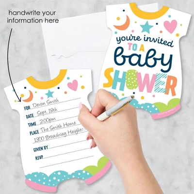 Colorful Baby Shower Fill-In the Blank Invitation Set INCLUDES 12 baby bodysuit invitations and 12 premium white envelopes. Colorful Baby Shower fill-in invitations are perfect for any event. The neutral colored theme is great for a gender neutral baby shower. Baby Bodysuit party invitations SIZE 5 inches by 7 inches. The included envelopes measure 5 inches by 7 inches. The back of each Colorful Baby Shower invitation has space to add your party details: For: Date: Time: Place: Given By: RSVP: PREMIUM PARTY INVITATIONS: Baby bodysuit party invitations are professionally printed on heavy-duty cardstock paper with a photo-like shine. They are individually inspected, then carefully packaged with our exclusive squiggle flap envelopes, making this Colorful Baby Shower stationary set a must-have for any gender neutral baby shower. MADE IN THE USA: Colorful Baby Shower – Gender Neutral Party Invitations are designed and manufactured at our Wisconsin facility using materials that are Made in the USA.