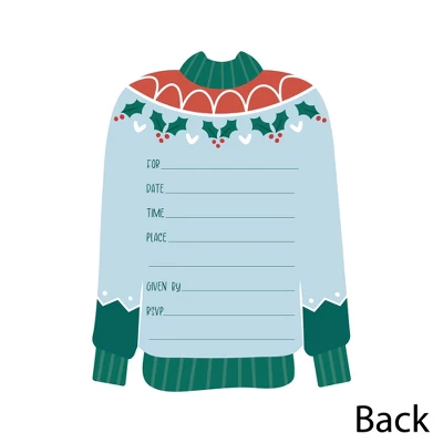Colorful Christmas Sweaters Fill-In the Blank Invitation Set INCLUDES 12 Jingle-bell sweaters party invitations and 12 premium white envelopes. Colorful Christmas Sweaters fill-in invitation is perfect for any event. The Mistletoe and Christmas Lights theme is great for a Ugly Sweater Holiday Christmas Party. Christmas Jumper party invitations SIZE 5 inches by 6.75 inches. The included envelopes measure 5 inches by 7 inches. The back of each Colorful Christmas Sweaters Ugly Sweater Holiday Christmas Party invitation has space to add your party details: For: Date: Time: Place: Given By: RSVP: PREMIUM PARTY INVITATIONS: Holiday Pullover Themed party invitation is professionally printed on heavy-duty card stock paper with a photo-like shine. They are individually inspected, then carefully packaged with our exclusive squiggle flap envelopes, making this Colorful Christmas Sweaters stationery set a must-have for any Ugly Sweater Holiday Christmas Party. MADE IN THE USA: Colorful Christmas Sweaters – Ugly Sweater Holiday Christmas Party Invitations are designed and manufactured at our Wisconsin facility using materials that are Made in the USA.