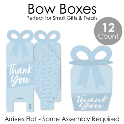 Bow Boxes INCLUDE: 12 Dusty Blue Elegantly Simple-themed square favor gift boxes. Each box SIZE measures 3.5 inches length x 3.5 inches width x 7 inches height. Bow boxes are ideal for small gifts and treats that are under 3.5 inches tall (height for storing items in closed box). When assembled and closed, each box creates a 3D paper bow-shaped top with a square bottom. CUTE GIFT BOXES: This small, closed favor box can be filled with homemade treats (fun cupcake box), party trinkets, or thank you gifts. At the party, have each guest fill their Light Powder Blue bow box with snacks from a candy buffet or use as a party loot box. Guests will have fun guessing what surprise each favor gift box contains. PREMIUM PARTY SUPPLY: Bow boxes are professionally printed and double-sided on heavy-duty cardstock paper, with a photo-like shine. They are hand-folded, individually inspected, and then carefully packaged. EASY ASSEMBLY: Dusty Blue Elegantly Simple bow boxes will arrive flat. Each bow box has crease lines and numbered tabs for easy folding. Finish the DIY assembly by interlocking top of box to create a three-dimensional bow. Packaging will include assembly instructions. MADE IN THE USA: Light Powder Blue Baby or Bridal Shower, Anniversary, Retirement, or Birthday Party bow boxes are designed and manufactured at our Wisconsin facility using materials that are Made in the USA.