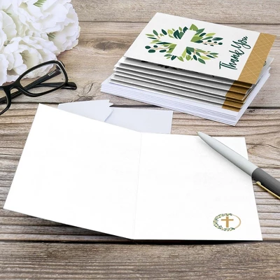 Elegant Cross Thank You Note Card Set INCLUDES 8 religious party thank yous and premium white envelopes. Elegant Cross thank you notes are perfect for any event. The cross theme is great for a baptism, Christening, First Communion, Confirmation or baby dedication party. Elegant Cross note cards SIZE 5.5 inches by 3.75 inches, folded. The included envelopes measure 5.75 inches by 3.75 inches. The inside of each Elegant Cross thank you card stationery has a fun graphic as well as space to write a special note to friends and family. PREMIUM THANK YOU CARDS: Elegant Cross thank you cards are professionally printed on heavy-duty card stock paper with a photo-like shine. They are hand-folded and individually inspected, then carefully packaged with our exclusive squiggle flap envelopes, making this religious stationary set a must-have for baptism, Christening, First Communion, Confirmation or baby dedication party. MADE IN THE USA: Elegant Cross – Thank You Cards are designed and manufactured at our Wisconsin facility using materials that are Made in the USA.