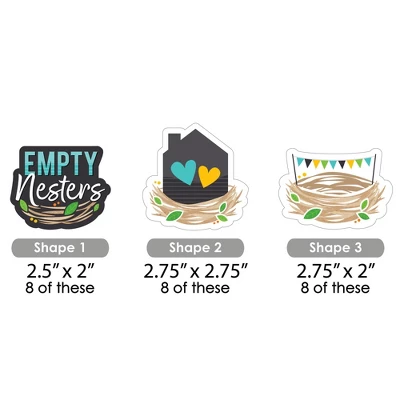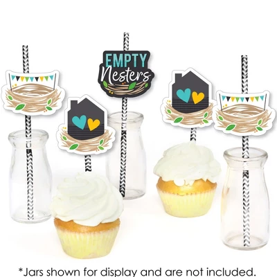 Big Dot of Happiness Empty Nesters Straw Decor INCLUDES 24 “They’ve Flown The Coop” paper cut outs, 24 coordinating paper straws, and 40 clear stickers for easy assembly. Empty Nesters DIY party supplies are perfect for a Empty Nest Party. Green & Blue Straw Decor party kit SIZE 8 – “Empty Nesters” Shape 1 Paper Die Cuts (2.5” x 2”), 8 – House in Nest Shape 2 Paper Die Cuts (2.75” x 2.75”), 8 – Nest Shape 3 Paper Die Cuts (2.75” x 2”), and 24 chevron striped paper straws 7.75″ tall. EASY PARTY DECORATIONS: Empty Nesters straw decor will add a touch of style to your Empty Nest Party tables. Green & Blue straw decor will also look great at your beverage bar. Use these adorable Green & Blue party accessories as straws or swizzle sticks. The paper straws can also be cut in half and used as cupcake picks once the shaped cut out is attached. PREMIUM PARTY SUPPLIES: Empty Nesters paper cut out straw decorations are professionally printed on heavy-duty cardstock paper with a photo-like shine. They are individually inspected and carefully packaged by hand, along with coordinating paper straws. Green & Blue Straw Decor will require some easy assembly. Simply adhere the shaped cut outs to the straws using the included clear stickers. Get creative with your DIY Empty Nest Party decoration ideas! Please Note: Mason Jars shown for display purposes and are not included.