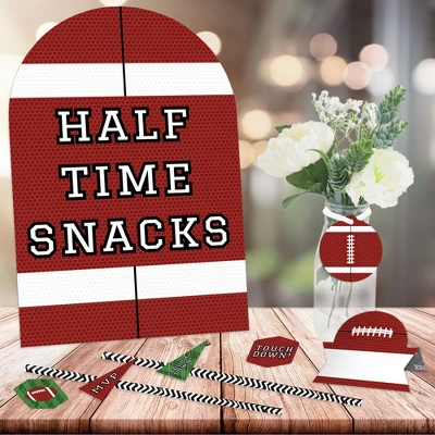 Sign with Stand includes 1 End Zone – Football sign with a built-in stand that you can place at your Snack bar. Sign measures 7.5 inches wide by 11 inches tall and requires some easy DIY assembly. To display, fold the sides of the stand towards the center and then fold down the support piece of the stand until it rests in the notches. Bunting Banner includes letters and themed pennants that measure 5 inches wide x 7.25 inches tall. Easily make a statement with this decorative banner at your Baby Shower or Birthday Party. Pennants spell out “Concession” and come in a numbered sequence with ribbon included for easy assembly. Tent Cards includes 12 place cards that measure 3 inches wide by 3.5 inches tall when assembled. To use, push back the top outer edge, revealing the half-circle top. Fold along the pre-scored line in the center to create the tent shape, and then add your own wording for display! Straw Decor Flags includes 12 flag pennant cut-outs, size 2.25 inches wide by 1.5 inches tall when folded, and chevron paper straws – 7.75 inches tall. To assemble, place the included adhesive dot to the inside of the flag and then attach the straw! Tags and Cut-outs includes 12 round tags and 12 hexagonal cut-outs. They measure 2.25 inches wide x 2.25 inches tall. Round tags come with playful End Zone – Football phrases and include coordinating pre-cut ribbon for easy DIY favor decorations. Cut-outs are reversible and make for the perfect table decor accents.