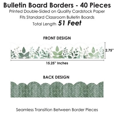 Eucalyptus Greenery Bulletin Board Borders INCLUDES a set of 40 scalloped trim decoration that will fit a standard classroom bulletin board. The reversible borders come with a front and back design and will have a seamless transition between the border pieces when placed next to each other. Vibrant Accent: Create a playful atmosphere when you use the boho botanical borders with your bulletin board display. These must-have schoolroom decorations are perfect for creating a coordinated yet fun look that will have students in the mood to learn. Classroom Essential: The greenery decorations are an easy way to brighten up your room. Easily attach the pieces to your bulletin board using tape or staples. You can also use the classroom borders to frame interior windows, doors, shelves, and more! For an exciting appearance, you can mix and match the designs! High-Quality Supply: The bulletin board borders are printed double-sided on quality cardstock paper. Each piece SIZE 15.25 inches wide by 2.75 inches tall for a total length of 51 feet. With proper care, the border trims can be used more than once. Made In The USA: Eucalyptus Greenery Bulletin Board Borders are designed and manufactured at our Wisconsin facility using materials that are Made in the USA.
