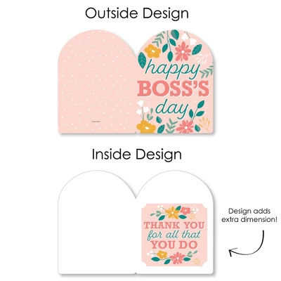Big Dot of Happiness Floral Best Boss Ever Jumborific Card INCLUDES 1 giant greeting card made of corrugated plastic. Send a big happy message with an oversized card. GIANT GREETING CARD: With a Curved shaped top, front of card reads “Happy Boss’s Day”. Open card to “Thank You For All That You Do” message that is layered for extra dimension. Left side of inside will be blank with lots of room to handwrite personal messages. PINK & TEAL FLOWER CARD: Wow a special occasion when you gift a Jumborific Card. The thick and sturdy plastic gives this card a unique display when in standing position and to be used for a memorable keepsake. Perfect way to say Merry Christmas. HIGH-QUALITY CARD: Floral Best Boss Ever Jumborific Card SIZE 16.5 inches wide (folded) x 22 inches tall. This giant greeting card is professionally printed on heavy-duty corrugated plastic with white edges. MADE IN THE USA: Big shaped Jumborific Card is designed and manufactured at our Wisconsin facility using materials that are Made in the USA.