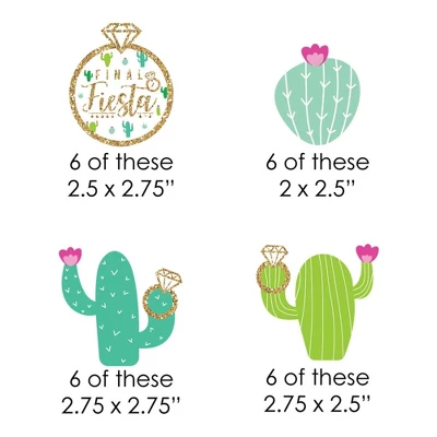 Final Fiesta Straw Decor INCLUDES 24 cactus and ring paper cut outs, 24 coordinating paper straws & 40 clear stickers for easy assembly. Final Fiesta DIY party supplies are perfect for a bachelorette party. Cactus and Ring Straw Decor party kit SIZE 6 ring paper die cuts (2.5″ X 2.75″), 6 cactus paper die cuts (2″ X 2.5″); 6 cactus paper die cuts (2.75″ X 2.75″); 6 cactus paper die cuts (2.75″ X 2.5″) and 24 chevron striped paper straws 7.75″ tall. EASY PARTY DECORATIONS: Final Fiesta straw decor will add a touch of charm to your bachelorette party tables. Final Fiesta straw decor will also look great at your beverage bar. Use these adorable last fiesta party accessories as straws or swizzle sticks. The paper straws can also be cut in half and used as cupcake picks once the shaped cut out is attached. PREMIUM PARTY SUPPLIES: Final Fiesta paper cut out straw decorations are professionally printed on heavy-duty card stock paper with a photo-like shine. They are individually inspected and carefully packaged by hand, along with coordinating paper straws. Mexican Fiesta Straw Decor will require some easy assembly. Simply adhere the shaped cut outs to the straws using the included clear stickers. Get creative with your DIY bachelorette party decoration ideas! Please Note: Mason Jars shown for display purposes and are not included. Final Fiesta – Bachelorette Party Striped Decorative Straws use a No-Mess Glitter Print: Our wrappers are designed with a printed image of glitter, eliminating glitter flake while maximizing bling effect!
