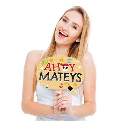 10-Piece Funny Pirate Ship Adventures Photo Booth Props Kit INCLUDES 10 Ahoy Matey Skull arrow and speech bubble photo booth props, 10 sticks and stickers for assembly. EASY ASSEMBLY: Simply attach the printed DIY photo booth props to the sticks with included reinforcing stickers. PERFECT FOR ANY CROWD! Photo booth props are fun Birthday Party supplies for adults and kids – everyone will love the funny sayings on these Pirate Ship Adventures photo booth props. Take entertaining and shareable party photos while making memories with these funny photo booth props! AHOY MATEY SKULL PARTY DECORATIONS: Many fun ways to use these cute photo booth props! Use as intended and take party photos to share; Add them to vases and floral arrangements as a fun party centerpiece; Accent your Pirate Ship Adventures candy buffet by displaying them in apothecary candy jars; Adhere as direction arrows to walls and your guests to the Birthday Party! HIGH-QUALITY: Pirate Ship Adventures photo booth props are professionally printed on thick cardstock paper. They will arrive cut out and ready to assemble with the included sticks and stickers. MADE IN THE USA: Funny Pirate Ship Adventures – Party Photo Booth Props Kit is designed and manufactured at our Wisconsin facility using materials that are Made in America.
