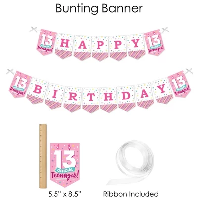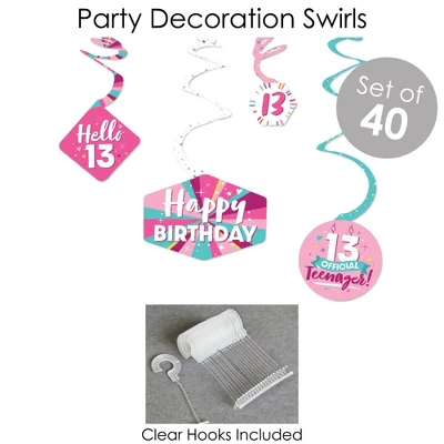 BUNTING BANNER includes: letter and themed pennants. Each pennant measures 8.5″ high x 5.5″ wide. Pennants are numbered in sequence and ribbon is included for easy assembly. PARTY DECORATION SWIRLS includes: 4 different shapes, 10 count per shape, that hang below an accordion-style spiral. Professionally printed double-sided, each decoration swirl in the 40-piece set has a pre-cut hole for easy assembly using the included clear hooks. Party decoration swirls will arrive flat. TABLE TOPPERS includes: 15 Girl 13th Birthday centerpiece sticks in three different shapes, each professionally printed double-sided. To use as centerpieces or photo props, wooden dowels and assembly stickers are included. CIRCLE CONFETTI includes: three different sizes of circles – 12 small circles, size 2.75″, 9 medium circles, size 4.25″, and 6 large circles, size 5.5″. Professionally printed double-sided with coordinating teenager designs, circle confetti can be scattered around your table. FAVOR KIT: CANDY STICKERS includes: 2 sheets mini candy bar wrappers (total 40), 2 sheets round candy stickers (total 216), 2 sheets circle stickers (total 48). Easy assembly with this peel and stick favor kit. Simply center and press stickers onto your favorite candies to style candy buffets or decorate take-home favors for party guests. Note: Candy is not included.