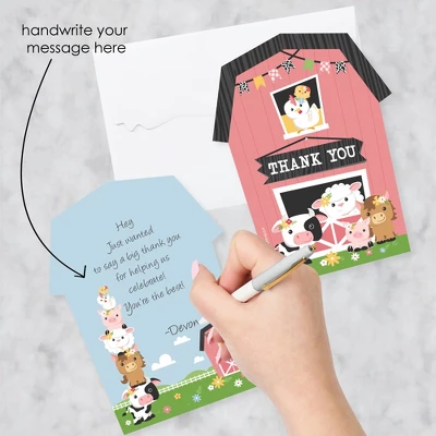 Shaped Thank You Cards Set INCLUDES 12 Girl Farm Animals Baby Shower or Birthday Party thank you cards and 12 premium white envelopes. Pink Barnyard Shaped Thank You Cards are the perfect end to any event. Pink Barnyard party thank you note cards SIZE 5 inches by 7 inches. The included envelopes measure to fit 5 inches by 7 inches cards. The back of each Girl Farm Animals Baby Shower or Birthday Party thank you has space to write a personal message of thanks. PREMIUM PARTY THANK YOU CARDS: Girl Farm Animals party thank you cards are professionally printed on heavy-duty cardstock paper with a photo-like shine. They are individually inspected, then carefully packaged with our exclusive squiggle flap envelopes, making this Girl Farm Animals stationery set a must-have for any Baby Shower or Birthday Party. MADE IN THE USA: Girl Farm Animals Party Thank You Cards are designed and manufactured at our Wisconsin facility using materials that are Made in America.
