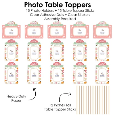 Girl Little Pumpkin Photo Table Toppers INCLUDE 15 sturdy and professionally printed paper photo holders and 15 table topper sticks. Each photo holder has pre-cut tabs to display your 4×6 photos vertically or horizontally. Clear stickers are included to easily assemble the stick to photo holder. DIY CENTERPIECE STICKS: Create picture-perfect centerpieces for your Fall Birthday Party or Baby Shower with Girl Little Pumpkin Photo Table Toppers. Each photo holder has 4 pre-cut slits to tab your 4×6 photos in place. (Note: Your photo will tab through back design of photo holder.) Then attach one table topper stick to one completed photo holder piece with the included clear stickers. EASY PUMPKIN PARTY DECOR: Girl Little Pumpkin Photo Table Topper decorations can be used as centerpieces when attached to the included sticks and inserted into vases or floral arrangements. They easily accent your Fall Birthday Party or Baby Shower candy buffet when you add them to apothecary jars. Photo Table Toppers are a great addition to any Fall Birthday Party or Baby Shower and a fun way to proudly show off the guest of honor. PREMIUM PARTY DECORATION: Girl Little Pumpkin Fall Birthday Party or Baby Shower Photo Table Toppers are professionally printed double-sided on heavy-duty cardstock paper. This set of paper picture frames includes 10 count vertical photo display SIZE 5.5 inches wide x 8.75 inches tall and 5 count horizontal photo display SIZE 7.5 inches wide x 6.75 inches tall. Each photo holder fits your own 4×6 photo size. The included 15 table topper sticks each SIZE 12 inches tall. Do-it-yourself assembly required. MADE IN THE USA: Autumn Pumpkin Photo Table Toppers are designed and manufactured at our Wisconsin facility using materials that are Made in the USA.
