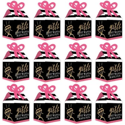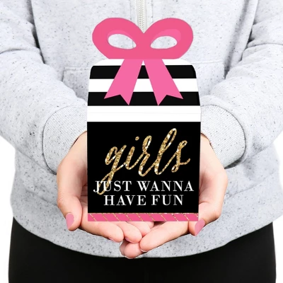 Bow Boxes INCLUDE: 12 “Girls Just Wanna Have Fun”-themed square favor gift boxes. Each box SIZE measures 3.5 inches length x 3.5 inches width x 7 inches height. Bow boxes are ideal for small gifts and treats that are under 3.5 inches tall (height for storing items in closed box). When assembled and closed, each box creates a 3D paper bow-shaped top with a square bottom. CUTE GIFT BOXES: This small, closed favor box can be filled with homemade treats (fun cupcake box), party trinkets, or thank you gifts. At the party, have each guest fill their Party Ready Pink, Black, White and Gold bow box with snacks from a candy buffet or use as a party loot box. Guests will have fun guessing what surprise each favor gift box contains. PREMIUM PARTY SUPPLY: Bow boxes are professionally printed and double-sided on heavy-duty cardstock paper, with a photo-like shine. They are hand-folded, individually inspected, and then carefully packaged. EASY ASSEMBLY: “Girls Just Wanna Have Fun” bow boxes will arrive flat. Each bow box has crease lines and numbered tabs for easy folding. Finish the DIY assembly by interlocking top of box to create a three-dimensional bow. Packaging will include assembly instructions. MADE IN THE USA: Party Ready Pink, Black, White and Gold Bachelorette Party, Bridal Shower or Girls’ Night Out bow boxes are designed and manufactured at our Wisconsin facility using materials that are Made in the USA. “Girls Just Wanna Have Fun” bow boxes use a No-Mess Glitter Print: Our DIY favor boxes are designed with a printed image of glitter, eliminating glitter flake while maximizing bling effect!